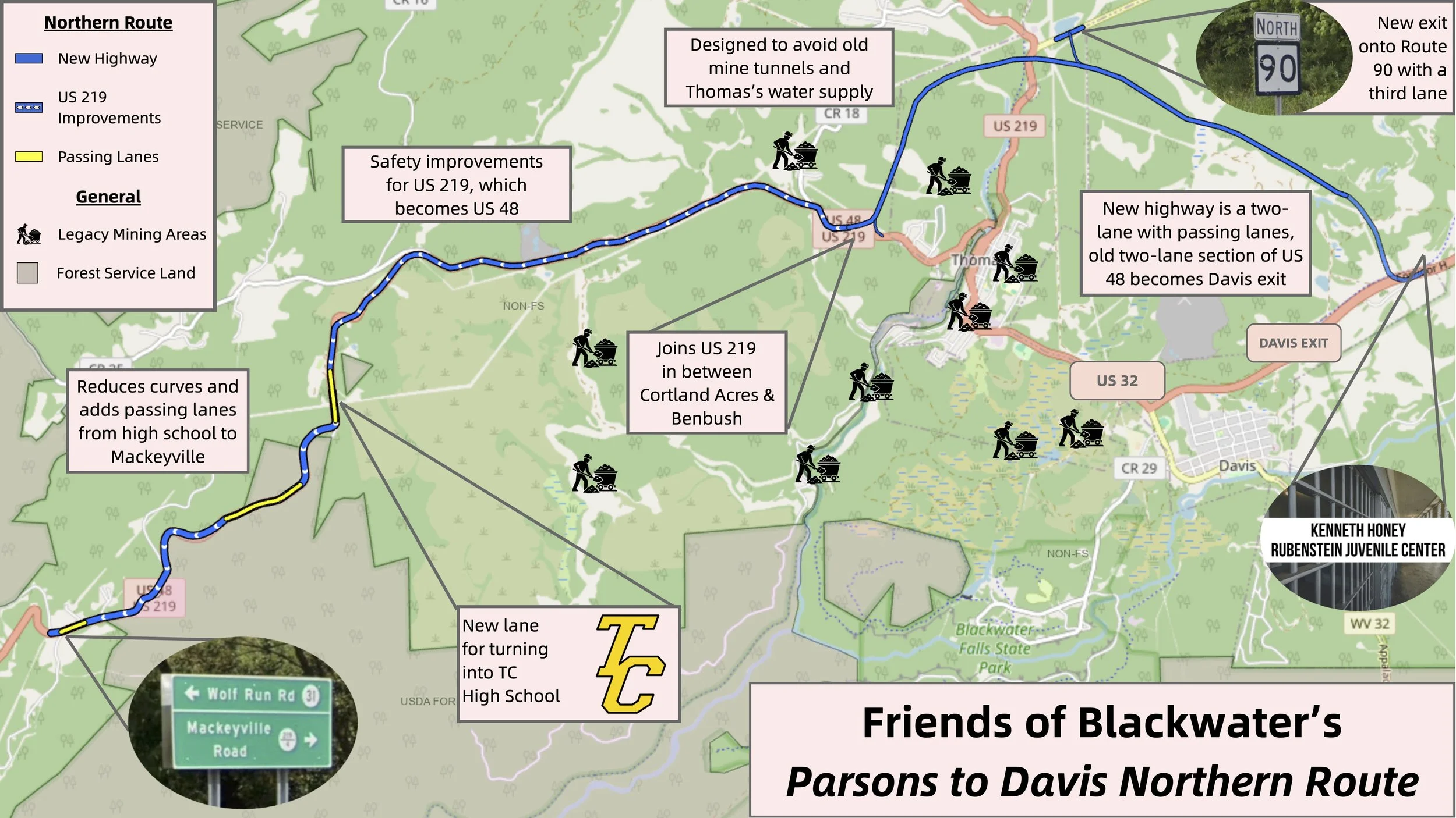 In August 2023 under pressure from the public the West Virginia Division of Transportation agreed to study a northern route for the Parsons to Davis. They have applied for and received a permit for core drilling under a wastewater permit from the WV Department of Environmental Protection. They have applied for a similar permit for core drilling on the western end of the Parson to Davis route