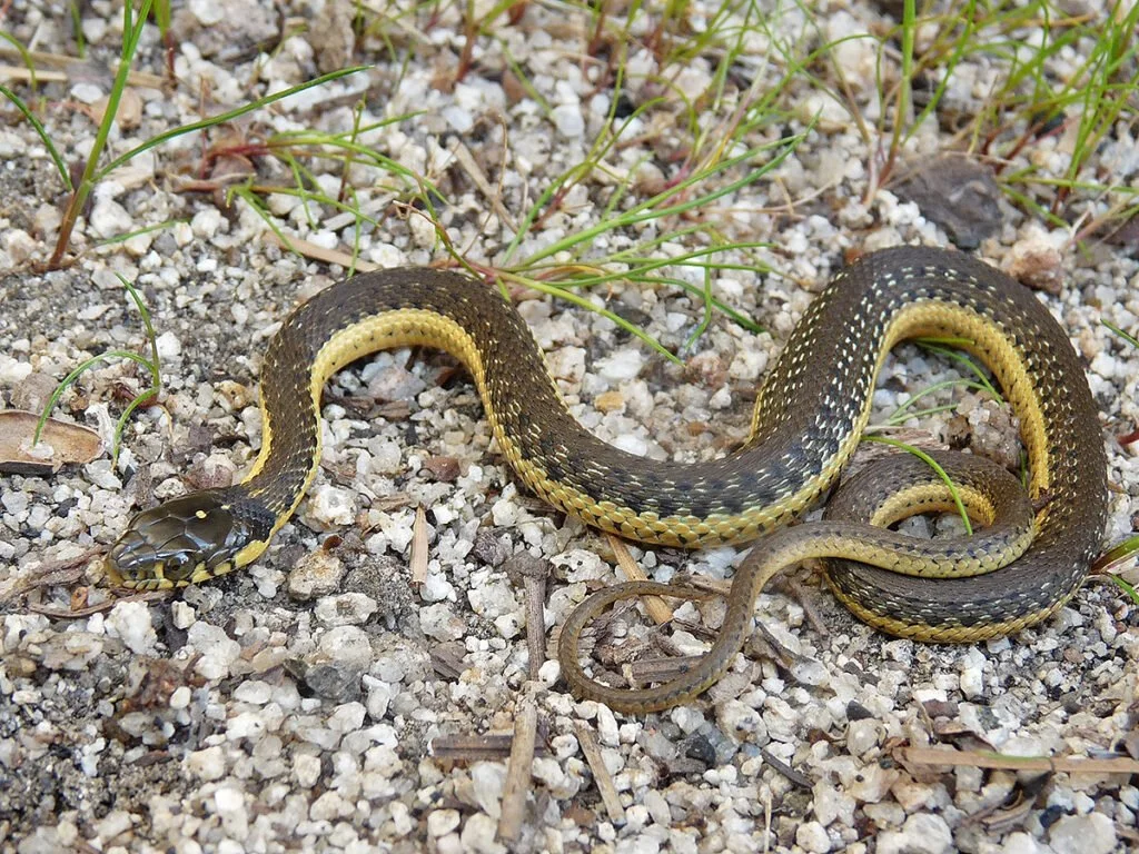Eastern Garter-snakes are non-venomous, and usually docile. They are often nicknamed “garden snakes” as they will frequent gardens and often deter mice or scavengers from eating the crops.