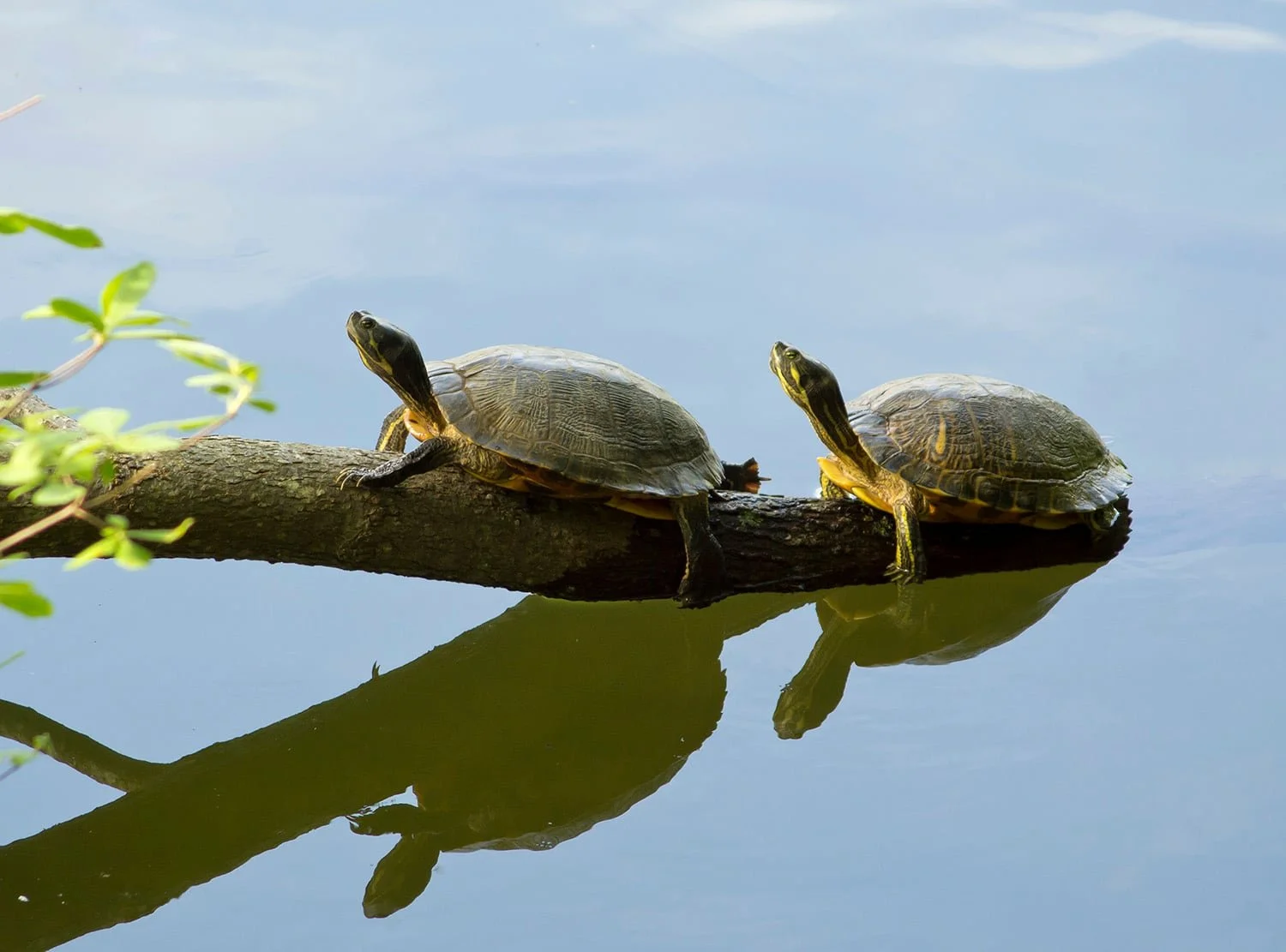 Midland Painted Turtles keep-out of fast flowing water sources and opt for more gentle, shallow habitat with abundant vegetation. They inhabit bogs, fens, ponds, marshes, swamps and slow-moving rivers. They have a dark carapace and a yellow plastron with red markings along the edge. Their necks are striped with red tones closer to the body, and yellow up toward the beak. They have a set of yellow blotches on top of their heads. They’re small maxing out at a mere 25 cm.
