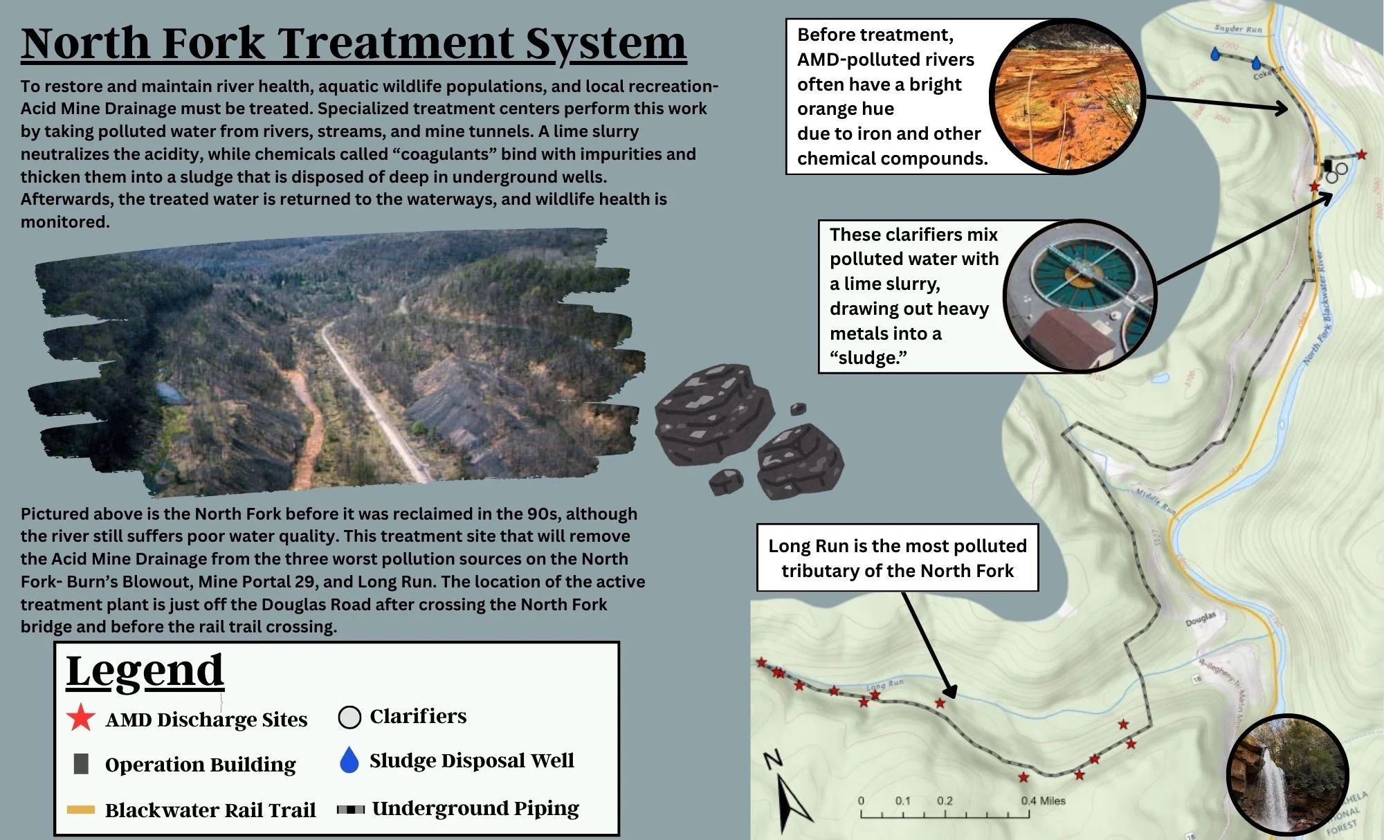 The North Fork active treatment design began in August 2019 when the DEP Division of Land Restoration (DLR) came to us with the invitation to collaborate on this watershed-changing project. FOB is excited to be working with BioMost and DLR engineers to design this treatment site that will remove the Acid Mine Drainage from the three worst pollution sources on the North Fork- Burn’s Blowout, Mine Portal 29, and Long Run. The location of the active treatment plant is just off the Douglas Road after crossing the North Fork bridge and before the rail trail crossing.